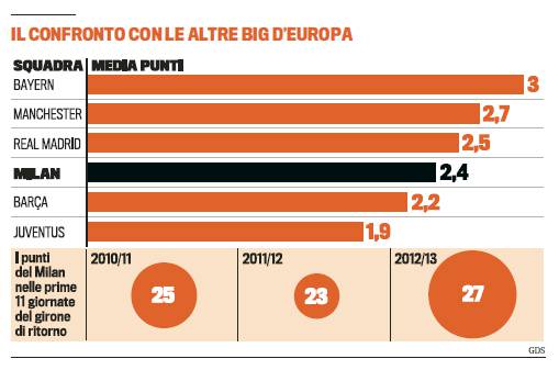 MILAN 2013 – E’ un Milan semplicemente sensazionale quello del 2013. La squadra rossonera ha saputo totalizzare ben 27 punti in 11 giornate subendo 0 sconfitte e totalizzando ben 2,4 punti a match. Una media punti altissima, la quarta in Europa dietro a Bayern Monaco, Manchester United e Real Madrid, e davanti addirittura a Barcellona e Juventus. Allegri ha fatto meglio dell’anno dello scudetto (25 i punti conquistati due anni fa), nonchè dell’anno scorso (23). La classifica italiana del 2013 vedrebbe i rossoneri al primo posto, seguiti dal Napoli a 22 e dalla Juve a 21. Sorprendente, infine, il dato relativo ai gol subiti nell’anno in corso, soltanto 6, uno in meno della Juve e 3 del Napoli.