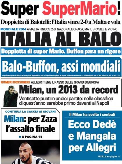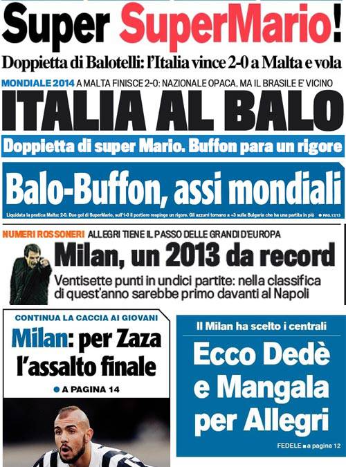 Rassegna stampa Milan: Super Balo, Milan 2013 da record, 3 nuovi arrivi per Allegri… – Foto 28/03/2013 - 19:2727/03/2013 - 07:12 di Redazione2 RASSEGNA STAMPA MILAN FOTO – Di seguito potete trovare i principali titoli dei tre quotidiani sportivi, La Gazzetta dello Sport, Corriere dello Sport e Tuttosport, riguardanti naturalmente il nostro Milan. La redazione di Milanlive.it