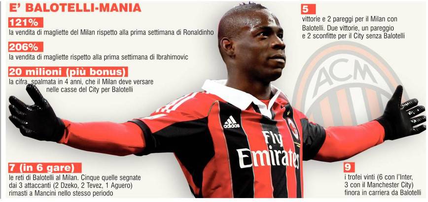 BALOTELLI MANIA – E’ letteralmente Balotelli mania in casa Milan e lo si capisce da i numeri “prodotti” dal rossonero. Il bomber italiano ha fino ad oggi siglato 7 gol in 6 gare di Serie A, in confronto ai 5 gol segnati in totale dai 3 attaccanti del City, Dzeko, Aguero e Tevez. Sette marcature che hanno fruttato al Milan ben 13 punti, permettendo alla squadra di godersi in solitaria il terzo posto e di avvicinare il Napoli. Importanti anche i numeri legati al marketing. Balo ha surclassato Ibra nella vendita di magliette, ma soprattutto Dinho, una delle maglie più vendute nella storia dei rossoneri, con incrementi a tripla cifra. I 20 milioni di euro investiti più bonus sono quindi una spesa che sta già ripagando il Milan: e il bello deve ancora venire…