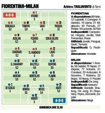 FIORENTINA MILAN PROBABILI FORMAZIONI – Poco più in basso potrete visionare le probabili formazioni di Fiorentina-Milan targate Tuttosport. La sfida si giocherà domenica mezzogiorno, ore 12.30, in quel dell’Artemio Franchi, e Allegri pare aver già individuato l’11 che scenderà in campo. Piccolo dubbio per Ambrosini, che ieri si è fermato durante l’amichevole per un dolore muscolare. A centrocampo, al fianco di Montolivo, favoriti Muntari e Flamini. In attacco ci sarà il Boa sull’out di destra con Balotelli ed El Shaarawy e Pazzini partirà di conseguenza in panchina. In difesa, infine, confermato Bonera dal primo minuto. In casa Viola, assenti Jovetic e Fernandez per infortunio con il dubbio Pizarro. Out anche Gonzalez per squalifica. Da sottolineare, infine, il recupero di Giuseppe Rossi che naturalmente non sarà in campo domenica ma che potrebbe fare la sua prima apparizione ufficiale con la maglia Viola il prossimo mese, il 5 maggio, nella sfida contro la Roma.