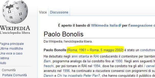 FUNEREO BONOLIS – Scherzo abbastanza funereo quello che ha subito nelle ultime ore Paolo Bonolis. Forse attaccato da un fan del Milan in seguito alle dichiarazioni shock di ieri, la pagina di Wikipedia del conduttore romano è stata modificata inserendo la data di nascita nonchè… quella di morte. Fino a poche ore fa si leggeva (prima della cancellazione), morto il 5 maggio del 2002, una data che i tifosi dell’Inter non dimenticheranno mai.