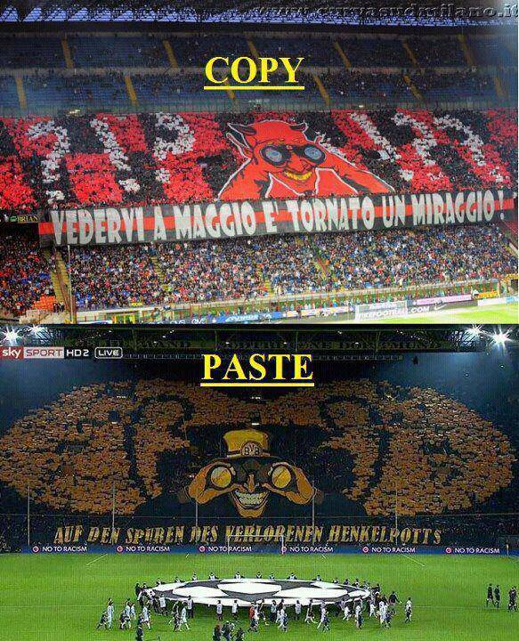 PLAGIO BORUSSIA MILAN – Interessante notizia segnalata in rete. Secondo quanto è possibile visionare dalle fotografie più in basso la curva del Borussia Dortmund, in occasione della sfida contro il Malaga di ieri sera, valevole per il ritorno di Champions League, avrebbe di fatto copiato un noto striscione del Milan di qualche tempo fa. Di seguito le foto delle due tifoserie a confronto: si tratta di plagio secondo voi?