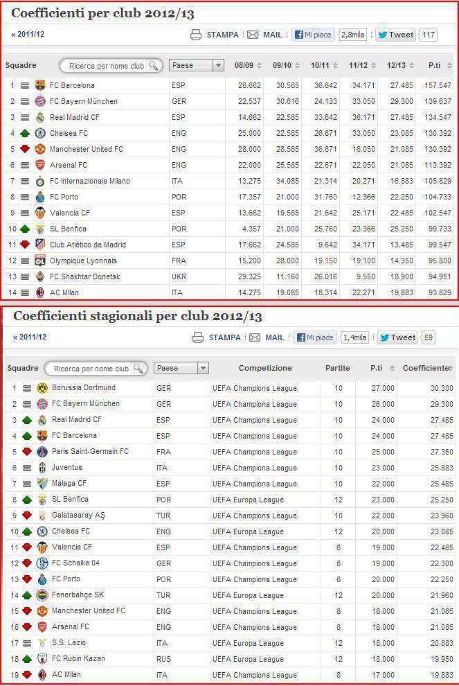 RANKING UEFA CLUB NAZIONI – Dopo le sfide di ieri di Europa League sono stati aggiornati i due ranking UEFA per club e per nazioni, sia a livello generale quanto stagionale. La Serie A si conferma sempre al quarto posto dietro a Spagna, Germania e Inghilterra. Un passo indietro invece per i rossoneri in stagione, che cedono spazio al Rubin Kazan piazzandosi al 19esimo posto. Nella graduatoria generale, invece, Milan sempre 14esimo.