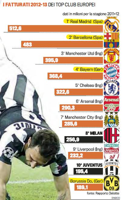 CLASSIFICA FATTURATO – La Gazzetta dello Sport ha effettuato un’inchiesta sul fatturato delle big del calcio mondiale, sottolineando il netto divario fra l’Italia, nonchè nazioni come la Spagna, l’Inghilterra e la Germania. Si scopre infatti come il Real Madrid, primo in assoluto, abbia un fatturato di ben 512,6 milioni di euro seguito dal Barcellona a quota 483. La prima italiana (ottavo posto in assoluto) è il Milan con “solo” 256,9 milioni di euro di fatturato annui, seguito al decimo posto dalla Juve (195,4). Rossoneri e bianconeri sono le uniche due italiane nella top 10.