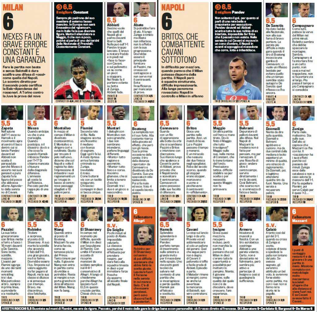 MILAN NAPOLI VOTI PAGELLE GAZZETTA DELLO SPORT – Di seguito potrete consultare i voti e le pagelle di Milan-Napoli, firmati Gazzetta dello Sport. La gara di San Siro di ieri sera si è conclusa con il risultato di 1 a 1. Alla rete di Flamini al 30esimo ha replicato pochi minuti dopo Goran Pandev. Migliori in campo fra i rossoneri, Kevin Constant e Christian Abbiati, autori di una buona prova. Male invece Flamini, che ha trovato il gol ma che si è fatto espellere dopo un fallaccio.