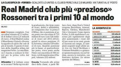 TOP 10 CLUB PIU’ PREZIOSI – Forbes, noto e stimato magazine finanziario americano, ha aggiornato la classifica dei 10 club di calcio più preziosi al mondo, quelli di maggiore valore tenendo conto di diversi aspetti come valore dei calciatori, marketing e risultati sul campo. Svolta storica in testa con il Real che supera per la prima volta lo United con un valore totale di 2,6 miliardi di euro (i Red Devils sono a quota 2,4). Milan prima italiana con 0,72 miliardi di euro (al sesto posto), seguito all’ottavo posto dalla Juve con 0,55. Solo quattordicesima l’Inter.