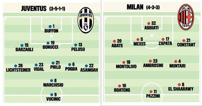 JUVENTUS MILAN PROBABILI FORMAZIONI – Poco più in basso troverete le probabili formazioni di Juventus-Milan firmate Tuttosport, sfida che si terrà domani sera allo Juventus Stadium alle 20.45. Pochi dubbi per Allegri che dovrà fare a meno di Flamini e Balotelli, entrambi squalificati. In attacco favorito Boateng sull’esterno di destra, al fianco di Pazzini ed El Shaarawy. Piccola novità a centrocampo con Ambrosini che torna in cabina di regia e Montolivo che trasloca sulla destra con Muntari a sinistra. In difesa, dubbio Constant-De Sciglio.