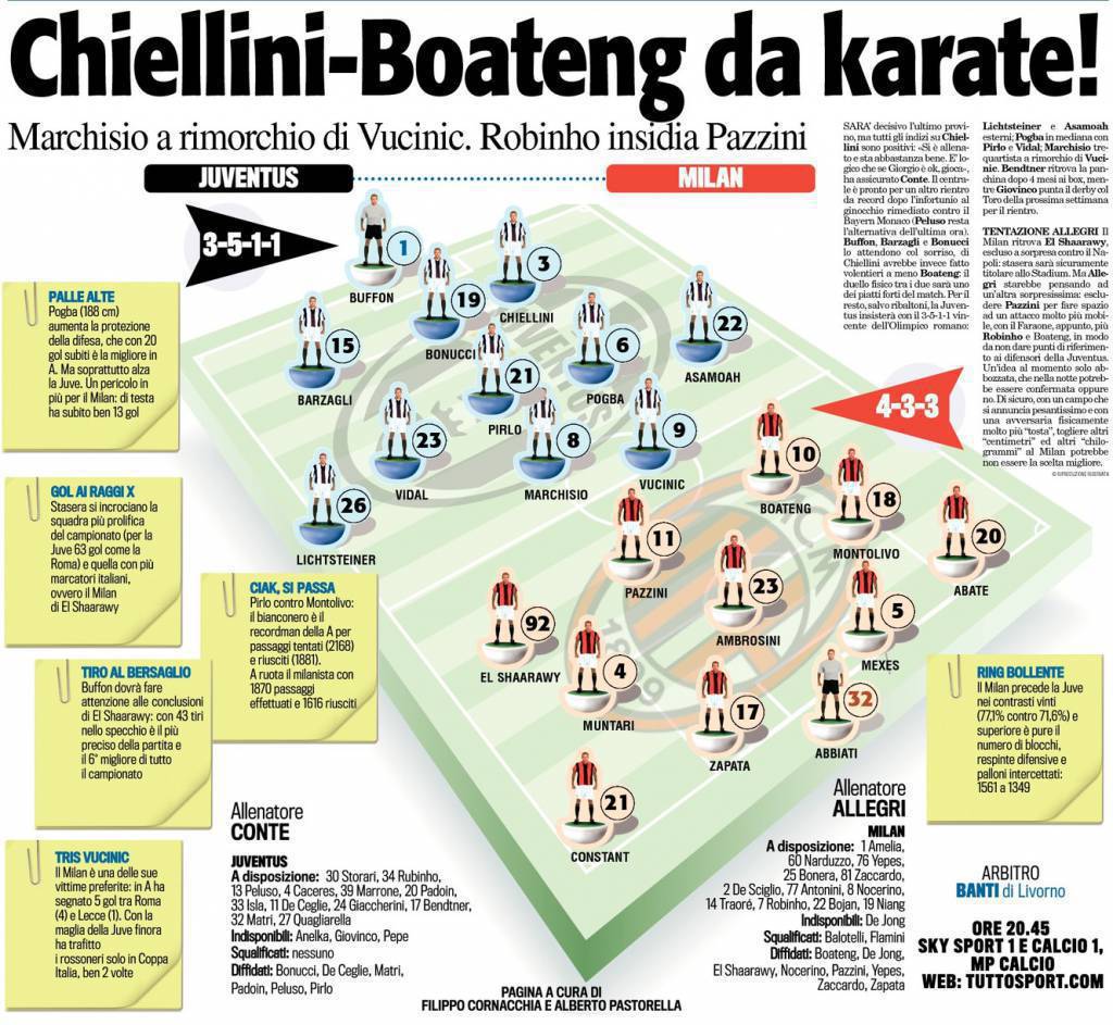JUVENTUS MILAN PROBABILI FORMAZIONI – Ancora poche ore e Juventus-Milan andrà in scena. Gli 11 bianconeri sono praticamente fatti, con il recupero di Chiellini, e lo schieramento di Marchisio dietro a Vucinic in un 3-5-1-1. Allegri ha ancora qualche dubbio, in particolare in attacco. Le formazioni danno Pazzini al fianco di El Shaarawy e Boateng ma non è da escludere che il Conte Max possa lasciare il Pazzo in panchina per fare spazio a Robinho per un tridente decisamente meno profondo ma più tecnico, dinamico e che non lasci punti di riferimento agli avversari. A centrocampo Ambrosini in regia con Montolivo e Muntari ai fianchi. In difesa, infine, ballottaggio Constant-De Sciglio sulla sinistra con il primo favorito.