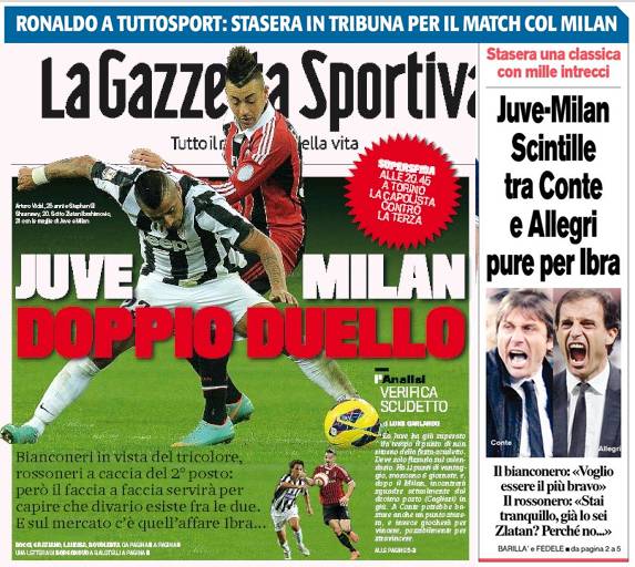 Rassegna stampa Milan: scintelle Conte Allegri anche per Ibra, doppio duello, stasera il Fenomeno in tribuna – Foto 23/04/2013 - 18:2821/04/2013 - 07:18 di Redazione2 RASSEGNA STAMPA MILAN FOTO – Di seguito potete trovare i principali titoli dei tre quotidiani sportivi, La Gazzetta dello Sport, Corriere dello Sport e Tuttosport, riguardanti naturalmente il nostro Milan. La redazione di Milanlive.it