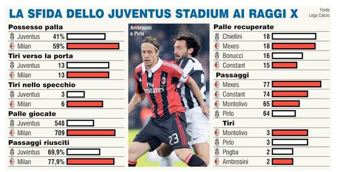 JUVENTUS MILAN STATISTICHE MATCH – Sono tutte in favore del Milan le statistiche relative alla sfida contro la Juventus di ieri sera. Il Diavolo ha saputo fare meglio in possesso palla, tiri nello specchio, palloni giocati, e percentuale di passaggi riusciti, pareggiando nei tiri totali. Peccato però che alla fine abbia vinto la Juventus con il risultato di 1 a 0. Al Milan è infatti mancato il goleador e l’assenza di Balotelli e la fase involutiva di El Shaarawy e Pazzini si sono fatti decisamente sentire.