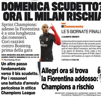 Rassegna stampa Milan: Champions a rischio per il Milan, cori razzisti contro il Boa – Foto 23/04/2013 - 18:2622/04/2013 - 06:10 di Redazione2 RASSEGNA STAMPA MILAN FOTO – Di seguito potete trovare i principali titoli dei tre quotidiani sportivi, La Gazzetta dello Sport, Corriere dello Sport e Tuttosport, riguardanti naturalmente il nostro Milan. La redazione di Milanlive.it