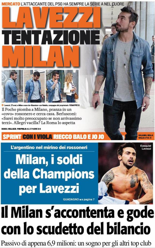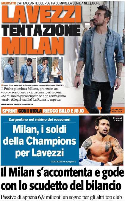 Rassegna stampa Milan: tentazione Lavezzi! Vinto lo scudetto del bilancio… – Foto 23/04/2013 - 18:2623/04/2013 - 06:15 di Redazione2 RASSEGNA STAMPA MILAN FOTO – Di seguito potete trovare i principali titoli dei tre quotidiani sportivi, La Gazzetta dello Sport, Corriere dello Sport e Tuttosport, riguardanti naturalmente il nostro Milan. La redazione di Milanlive.it