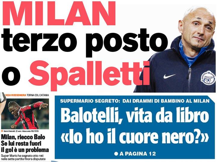 Rassegna stampa Milan: Spalletti se non sarà terzo posto, Balotelli vita da libro… – Foto 27/04/2013 - 14:5124/04/2013 - 06:17 di Redazione2 RASSEGNA STAMPA MILAN FOTO – Di seguito potete trovare i principali titoli dei tre quotidiani sportivi, La Gazzetta dello Sport, Corriere dello Sport e Tuttosport, riguardanti naturalmente il nostro Milan. La redazione di Milanlive.it