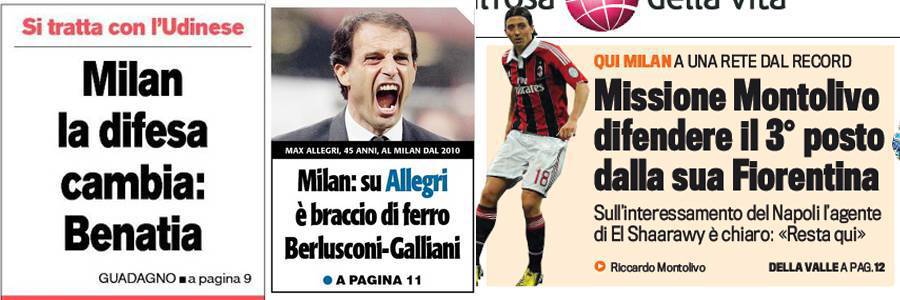 Rassegna stampa Milan: si compra in difesa, Allegri fra Berlusconi e Galliani, Montolivo difende il 3° posto – Foto 27/04/2013 - 14:5025/04/2013 - 06:16 di Redazione2 RASSEGNA STAMPA MILAN FOTO – Di seguito potete trovare i principali titoli dei tre quotidiani sportivi, La Gazzetta dello Sport, Corriere dello Sport e Tuttosport, riguardanti naturalmente il nostro Milan. La redazione di Milanlive.it