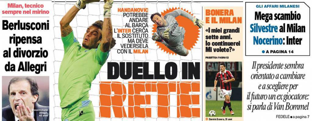 Rassegna stampa Milan: mega scambio fra Inter e Milan, duello per la porta con i nerazzurri, Berlusconi sceglie… – Foto 27/04/2013 - 14:4727/04/2013 - 06:32 di Redazione2 RASSEGNA STAMPA MILAN FOTO – Di seguito potete trovare i principali titoli dei tre quotidiani sportivi, La Gazzetta dello Sport, Corriere dello Sport e Tuttosport, riguardanti naturalmente il nostro Milan. La redazione di Milanlive.it
