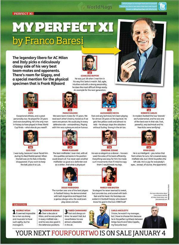 BARESI 53 ANNI – In occasione del compleanno della leggenda del Milan, Franco Baresi, che oggi compie 53 anni, la redazione di Milanlive.it è andata a ripescare un’intervista rilasciata dallo stesso Capitano a Fourfourtwo, noto mensile di calcio inglese. Nell’occasione Baresi individuò la sua top 11 di sempre. Uno squadrone decisamente da urlo, con giocatori del calibro di Maradona, Van Basten, Zidane, Giggs, Nesta, Maldini e altri ancora. Scopritela di seguito.