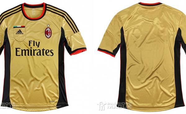 NUOVA MAGLIA MILAN 2013-2014 – Sono state diffuse online altre foto in alta qualità della nuova terza maglia del Milan, mostrata ufficialmente pochi minuti fa dal profilo Twitter dei rossoneri. Grazie alle nuove foto in alta qualità possiamo ammirare particolari “inediti” come il finto taschino ricamato sulla destra, “incorniciante” il logo Adidas e con un innesto tricolore. Sulla destra compare il classico simbolo del Milan mentre il collo è a girocollo nero e rosso. Le tre strisce Adidas sono nere mentre la maglietta è prevalentemente oro con due bande verticali nere che si raccordano fino alle maniche.