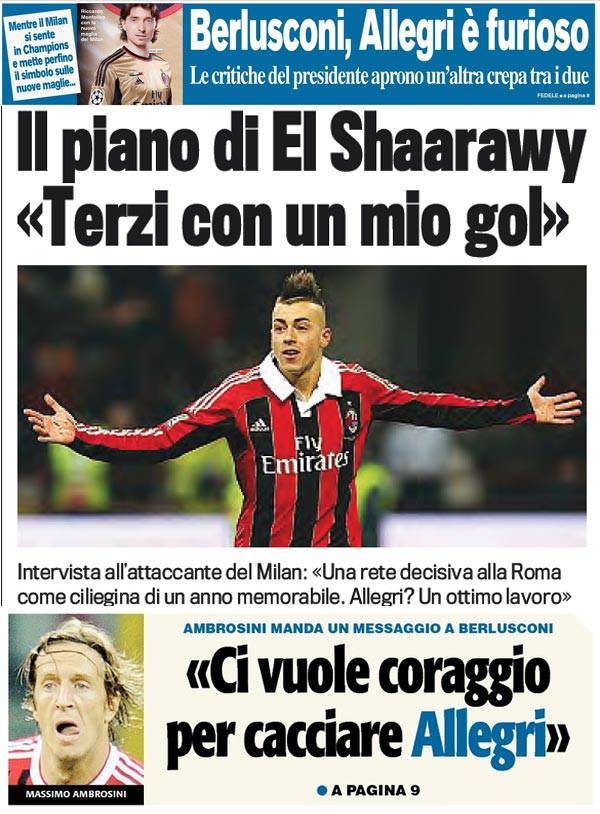 Rassegna stampa Milan: Allegri furioso con Berlusconi, El Sha promette un gol, Ambro dalla parte di Max – Foto 11/05/2013 - 07:03 di Redazione2 RASSEGNA STAMPA MILAN FOTO – Di seguito potete trovare i principali titoli dei tre quotidiani sportivi, La Gazzetta dello Sport, Corriere dello Sport e Tuttosport, riguardanti naturalmente il nostro Milan. La redazione di Milanlive.it