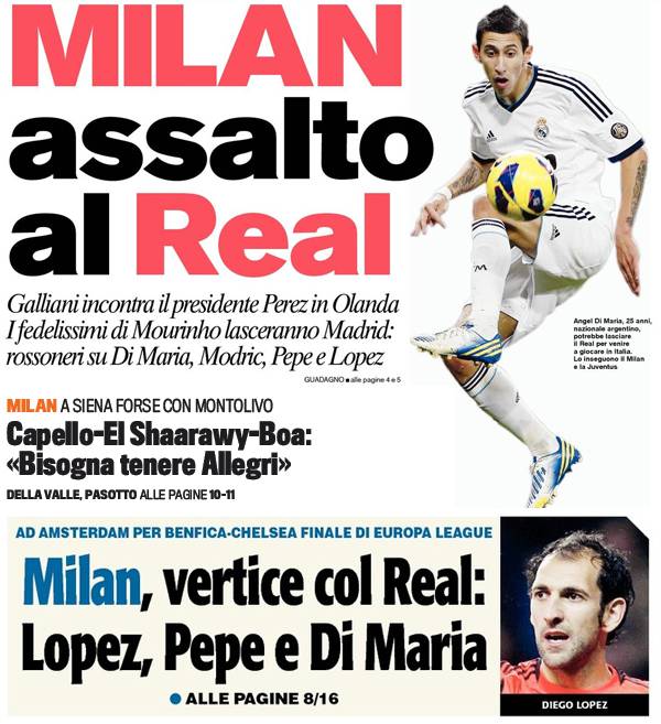 Rassegna stampa Milan: assalto a Di Maria e agli epurati del Real! Capello, Boa ed El Sha trattengono Allegri – Foto 15/05/2013 - 07:05 di Redazione2 RASSEGNA STAMPA MILAN FOTO – Di seguito potete trovare i principali titoli dei tre quotidiani sportivi, La Gazzetta dello Sport, Corriere dello Sport e Tuttosport, riguardanti naturalmente il nostro Milan. La redazione di Milanlive.it