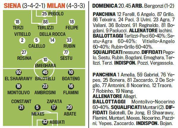 SIENA MILAN PROBABILI FORMAZIONI – Poco più in basso troverete le probabili formazioni di Siena-Milan firmate Gazzetta dello Sport. Allegri prova il recupero di Montolivo che potrebbe farcela dopo l’infortunio muscolare delle scorse settimane. Il “Monto” stazionerà sull’interno di sinistra al fianco di Ambrosini, in regia, e di Flamini. Out invece Muntari per squalifica. In attacco spazio al trio Balotelli, El Shaarawy e Boateng. In difesa, infine, preferito Constant a De Sciglio con Abate a destra e Mexes-Zapata classica coppia di centrali.