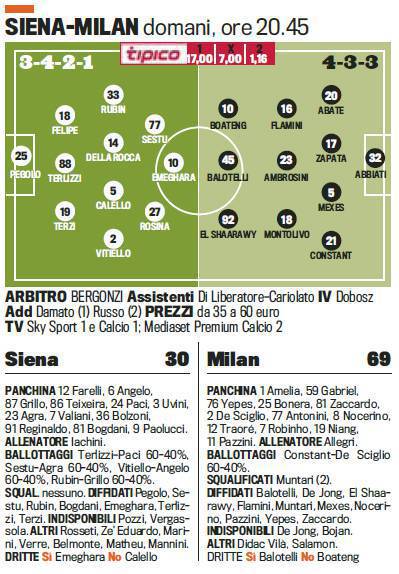 SIENA MILAN PROBABILI FORMAZIONI – Poco più in basso troverete le probabili formazioni di Siena-Milan firmate Gazzetta dello Sport. Belle nuove da Milanello visto che Riccardo Montolivo ha completamente recuperato e sarà quindi in campo domenica sera. Dovrebbe giocare sull’interno di sinistra lasciando la regia ad Ambrosini con Flamini sulla destra. Out Muntari per squalifica. In attacco spazio alle tre creste El Shaaarawy, Boateng e Balotelli, mentre in difesa Constant sulla sinistra con Abate a destra e Mexes-Zapata al centro. Abbiati, infine, stazionerà fra i pali.