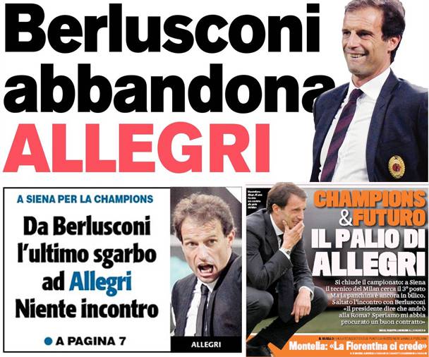 I titoli Gazzetta, CorSport e Tuttosport: Berlusconi abbandona Allegri, l’ultimo sgarbo – Foto 20/05/2013 - 09:2919/05/2013 - 07:28 di Redazione2 RASSEGNA STAMPA MILAN FOTO – Di seguito potete trovare i principali titoli dei tre quotidiani sportivi, La Gazzetta dello Sport, Corriere dello Sport e Tuttosport, riguardanti naturalmente il nostro Milan. La redazione di Milanlive.it
