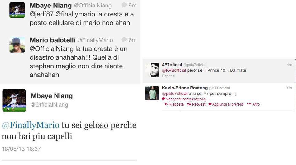 FOTO – Simpatico scambio di risposte su Twitter fra Balotelli e Niang, nonchè fra Boateng e l’ex Milan, Pato. I quattro hanno decisamente animato il noto social network nelle ultime ore, soprattutto Super Mario, iscrittosi solamente pochi giorni fa, e già con al seguito migliaia di followers. Di seguito lo scambio di battute fra Balotelli e Niang sui capelli, nonchè quello fra Pato e Boateng. Da segnalare anche un incitamento del Papero: “Forza Milan, terzo posto e’ vicino!!! Daii”.