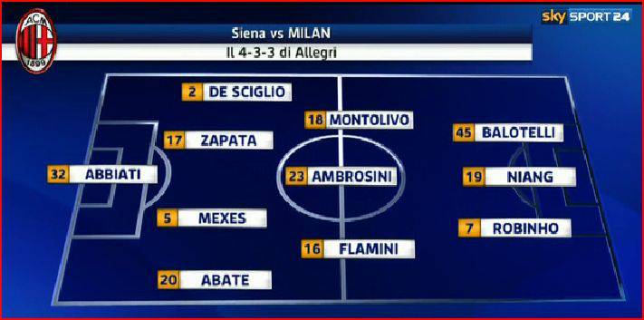 SIENA MILAN ULTIMISSIME FORMAZIONI – Si va verso l’esclusione di Stephan El Shaarawy dall’11 titolare per la sfida di questa sera fra il Siena e il Milan. Allegri sembra infatti voler puntare su Balotelli spalleggiato da Niang e Robinho con il Faraone, in fase negativa in questo periodo, che potrebbe così partire dalla panchina. Non si tratta di una bocciatura ma semplicemente di una questione di condizione fisica e di forma, probabilmente anche mentale. Attendiamo la conferma ufficiale ma Allegri sembra ormai aver scelto il trio d’attacco.