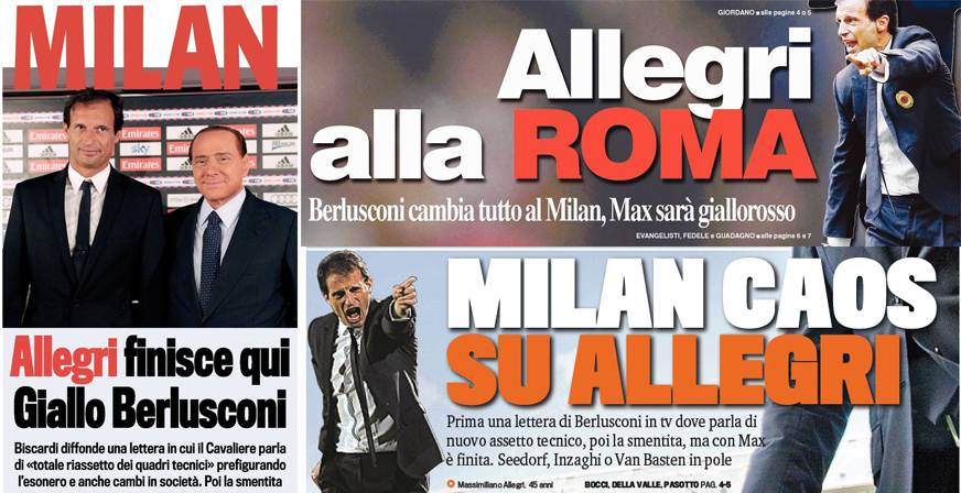 I titoli Gazzetta, CorSport e Tuttosport: Caos Allegri, giallo Berlusconi, Allegri alla Roma – Foto 31/05/2013 - 17:1921/05/2013 - 06:59 di Redazione2 RASSEGNA STAMPA MILAN FOTO – Di seguito potete trovare i principali titoli dei tre quotidiani sportivi, La Gazzetta dello Sport, Corriere dello Sport e Tuttosport, riguardanti naturalmente il nostro Milan. La redazione di Milanlive.it