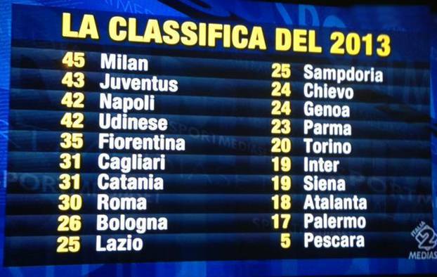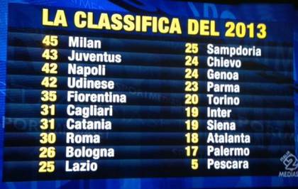 SERIE A CLASSIFICA 2013 – C’è chi si limita ad associare la conquista del terzo posto del Milan ai presunti favori arbitrali. Analizzando i dati e le statistiche, però, si scopre come i rossoneri siano stati i migliori durante il ritorno della stagione, o meglio, a partire dall’anno 2013. Da gennaio a domenica scorsa il Diavolo ha totalizzato ben 45 punti, due in più rispetto alla Juventus, e tre su Udinese e Napoli. Sorprese in fondo alla classifica, dove, al di là di Pescara, Palermo e Atalanta, troviamo un’Inter addirittura quart’ultima, a quota 19 punti, al pari del Siena.