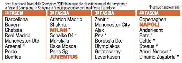 CHAMPIONS 2013 2014 – La Gazzetta dello Sport ha pubblicato stamane le quattro possibili fasce relative ai sorteggi dei gironi di Champions League 2013-2014. Ipotizzando che il Milan riesca a qualificarsi, superando i preliminari, i rossoneri saranno la squadra con il ranking più alto fra le tre italiane presenti. Il destino della Juve, invece, deriva dal Borussia: se i tedeschi vincono la Champions i bianconeri scivolano in terza fascia, altrimenti rimangono al fianco del Milan in seconda. Infine il Napoli, vista che la sua scarsa tradizione europea sarà ancora in quarta fascia (come due anni fa), con il rischio di un Girone di ferro.