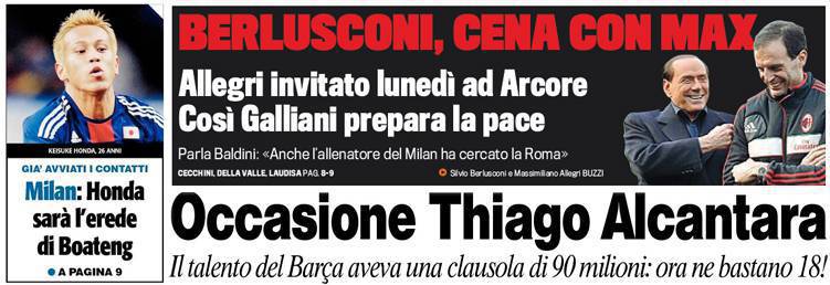 I titoli Gazzetta, CorSport e Tuttosport: ecco l’erede del Boa, cena di pace Max-Berlusconi, occasione Thiago – Foto 31/05/2013 - 17:1725/05/2013 - 07:06 di Redazione2 RASSEGNA STAMPA MILAN FOTO – Di seguito potete trovare i principali titoli dei tre quotidiani sportivi, La Gazzetta dello Sport, Corriere dello Sport e Tuttosport, riguardanti naturalmente il nostro Milan. La redazione di Milanlive.it