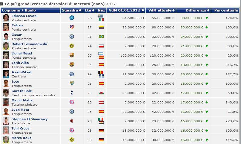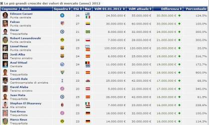 CALCIATORI VALORE – Il sito Transfermarkt.it, noto portale molto attento a tutto ciò che riguarda il mercato, ha pubblicato l’elenco dei giocatori che sono cresciuti maggiormente di valore nel 2012. Al primo posto c’è Edinson Cavani, che secondo il portale è passato da un valore di 24,5 milioni a 55 milioni. Presente in lista anche il nostro Stephan El Shaarawy, sicuramente una delle più belle rivelazioni della seconda metà del 2012. Il Faraone vale attualmente, sempre secondo Transfermarkt.it, ben 23 milioni di euro, rispetto ai soli 6 di inizio 2012.