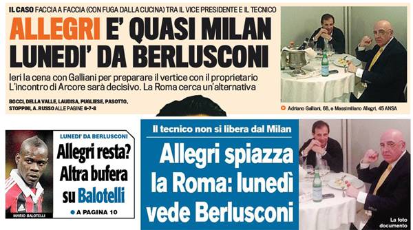 I titoli Gazzetta, CorSport e Tuttosport: Allegri è quasi Milan! Altra bufera su Balotelli – Foto 31/05/2013 - 17:1331/05/2013 - 07:10 di Redazione2 RASSEGNA STAMPA MILAN FOTO – Di seguito potete trovare i principali titoli dei tre quotidiani sportivi, La Gazzetta dello Sport, Corriere dello Sport e Tuttosport, riguardanti naturalmente il nostro Milan. La redazione di Milanlive.it