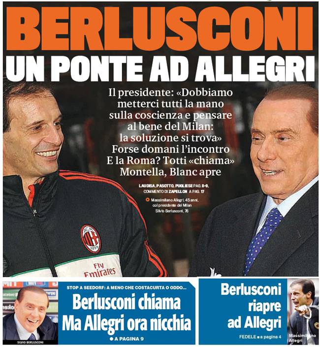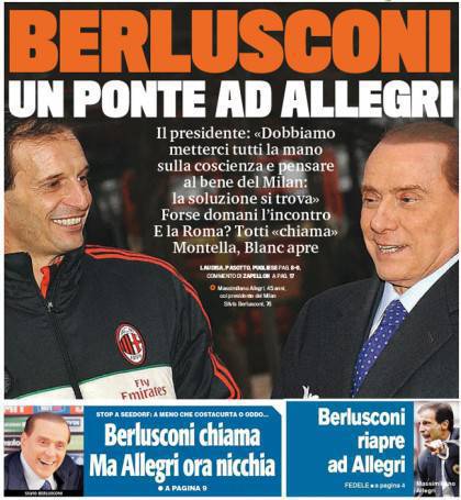 I titoli Gazzetta, CorSport e Tuttosport: Ponte di Berlusconi ad Allegri – Foto 01/06/2013 - 07:07 di Redazione2 RASSEGNA STAMPA MILAN FOTO – Di seguito potete trovare i principali titoli dei tre quotidiani sportivi, La Gazzetta dello Sport, Corriere dello Sport e Tuttosport, riguardanti naturalmente il nostro Milan. La redazione di Milanlive.it