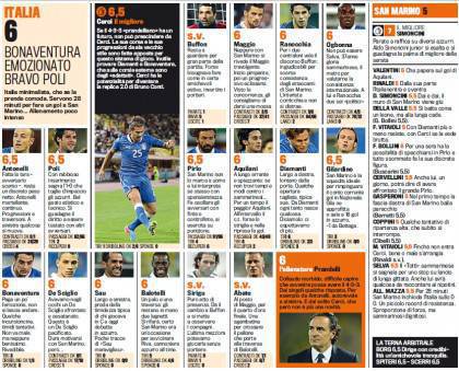 ITALIA SAN MARINO VOTI PAGELLE GAZZETTA – Di seguito potrete visionare i voti e le pagelle Gazzetta dello Sport di Italia-San Marino, gara amichevole conclusasi con il risultato di 4 a 0 per i nostri azzurri, giocatasi ieri sera allo stadio di Bologna, il Dall’Ara. Una vittoria dal sapore rossonero visto che il migliore in campo è stato Alessio Cerci, obiettivo di mercato del Milan, e in rete è andato anche Andrea Poli, che ha aperto le marcature e che si è meritato un bel 6,5 dalla Rosa. Sufficiente anche Balotelli, non al 100% e accolto con cori benevoli dal pubblico emiliano.