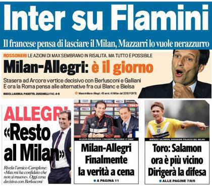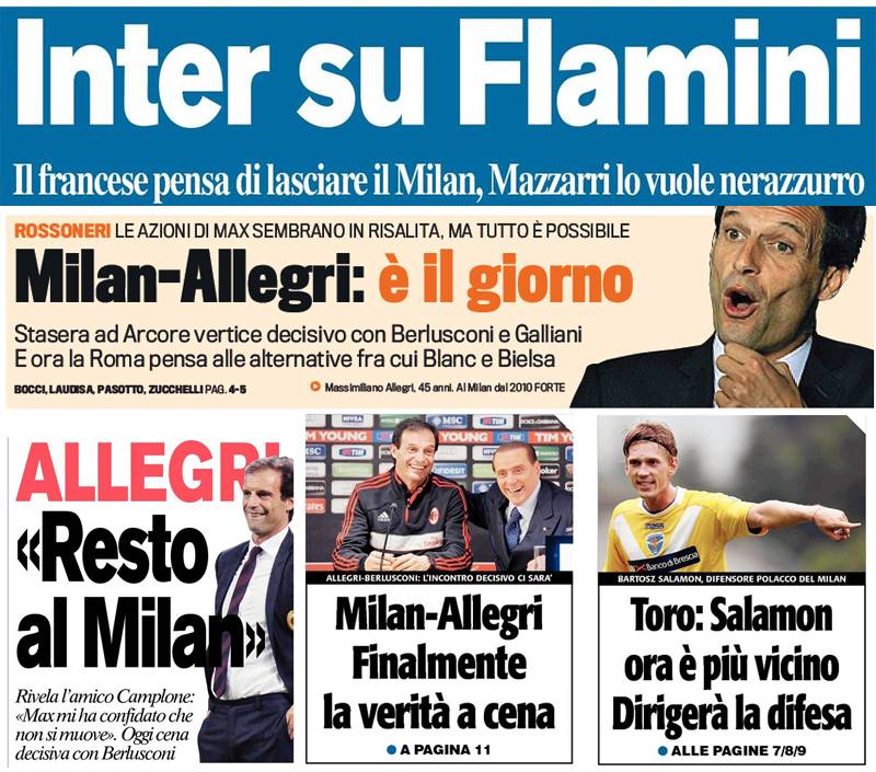 I titoli Gazzetta, CorSport e Tuttosport: Allegri è il giorno della verità, Flamini all’Inter, Salamon al Toro – Foto 02/06/2013 - 07:27 di Redazione2 RASSEGNA STAMPA MILAN FOTO – Di seguito potete trovare i principali titoli dei tre quotidiani sportivi, La Gazzetta dello Sport, Corriere dello Sport e Tuttosport, riguardanti naturalmente il nostro Milan. La redazione di Milanlive.it