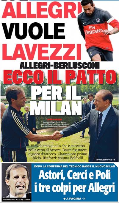 I titoli Gazzetta, CorSport e Tuttosport: Allegri vuole Lavezzi, ecco il patto per il Milan, Astori e Cerci… – Foto 04/06/2013 - 07:06 di Redazione2 RASSEGNA STAMPA MILAN FOTO – Di seguito potete trovare i principali titoli dei tre quotidiani sportivi, La Gazzetta dello Sport, Corriere dello Sport e Tuttosport, riguardanti naturalmente il nostro Milan. La redazione di Milanlive.it