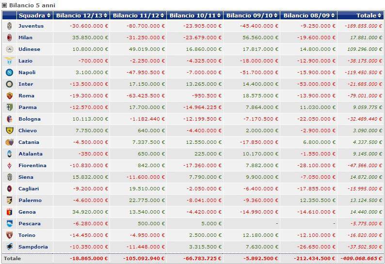 FOTO CALCIOMERCATO – Il noto sito Trasfermarket, uno dei portali più interessanti e attendibili per quanto riguarda il calciomercato, ha pubblicato il bilancio delle squadre di Serie A degli ultimi 5 anni, partendo dalla stagione 2008-2009 e arrivando fino a quella conclusasi poco fa. Il bilancio del Milan si chiude decisamente in attivo con una differenza positiva fra soldi spesi per gli acquisti e soldi incassati di circa 18 milioni di euro. Fa decisamente rabbrividire invece la Juventus, che vanta un meno 190milioni di euro, investimenti necessari per tornare a vincere lo scudetto e a qualificarsi in Champions League. Fra le società più virtuose, infine, spicca (una spanna sopra tutte), l’Udinese, con addirittura un +110 milioni di euro.