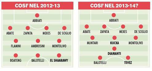 FOTO CALCIOMERCATO MILAN 2013-2014 – El Shaarawy potrebbe a breve trasferirsi nel Manchester City, l’ipotesi è al contempo concreta quanto preoccupante, visto che in casa Milan si rischia di vivere una nuova estate da incubo per i tifosi con le solite incertezze legate al futuro. Il Corriere dello Sport ha provato ad ipotizzare come potrebbe essere il Milan senza il Faraone, ma con tre nuovi innesti, a cominciare da Tevez, che finirebbe a Milano nell’ambito dell’operazione El Shaarawy, passando per Diamanti, trequartista dietro alle due punte, e arrivando fino a Kucka, che si posizionerebbe in cabina di regia al fianco di Montolivo e Muntari.