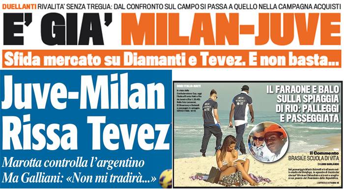 I titoli Gazzetta, CorSport e Tuttosport: sfida Milan-Juve per Tevez, Diamanti e non solo, Balo e Steph si divertono a Rio – Foto 11/06/2013 - 07:03 di Redazione2 RASSEGNA STAMPA MILAN FOTO – Di seguito potete trovare i principali titoli dei tre quotidiani sportivi, La Gazzetta dello Sport, Corriere dello Sport e Tuttosport, riguardanti naturalmente il nostro Milan. La redazione di Milanlive.it