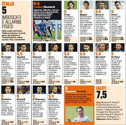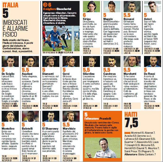 ITALIA HAITI VOTI PAGELLE GAZZETTA SPORT – Brutta figura per l’Italia nell’amichevole di ieri sera a Rio de Janeiro contro Haiti. La nazionale azzurra ha pareggiato due a due rendendosi protagonista di una partita decisamente negativa. Unico voto positivo è stato il 6 di Giaccherini, autore del gol lampo dopo pochi secondi, nonché il 6 di Sirigu che ha giocato solo metà gara. Male tutti gli altri azzurri compresi i rossoneri in campo, De Sciglio, Montolivo, Balotelli ed El Shaarawy.