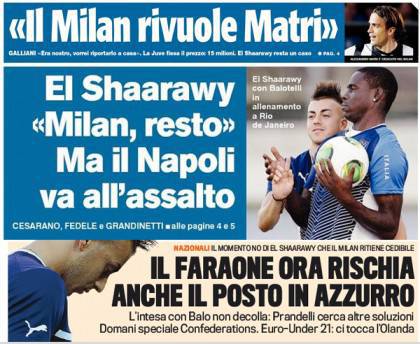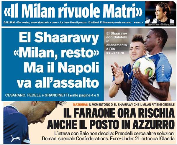 I titoli Gazzetta, CorSport e Tuttosport: Galliani chiama Matri, El Sha vuole restare ma “rischia” la Nazionale… – Foto 13/06/2013 - 07:09 di Redazione2 RASSEGNA STAMPA MILAN FOTO – Di seguito potete trovare i principali titoli dei tre quotidiani sportivi, La Gazzetta dello Sport, Corriere dello Sport e Tuttosport, riguardanti naturalmente il nostro Milan. La redazione di Milanlive.it