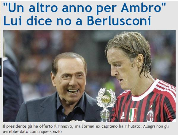 CALCIOMERCATO MILAN – E’ alquanto clamoroso il retroscena svelato dalla redazione di Sportmediaset riguardante il Milan e il suo ex capitano Ambrosini. Sul sito della nota redazione milanese si legge: “La delusione manifestata da Massimo Ambrosini deve aver fatto riflettere Silvio Berlusconi, che venerdì sera ha deciso di chiamare il centrocampista, ormai ex Milan, per offrirgli un altro anno di contratto. Offerta che il capitano uscente ha apprezzato, ma che ha deciso di rifiutare. Perché il suo allontanamento è di fatto dovuto a una scelta tecnica di Allegri e non avrebbe avuto senso rimanere, con la certezza di non poter trovare spazio”.