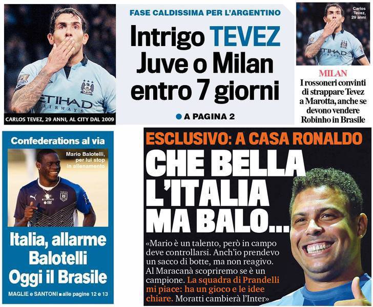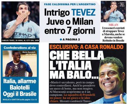 I titoli Gazzetta, CorSport e Tuttosport: intrigo Milan-Juve per Tevez, Ronaldo bacchetta Balotelli – Foto 15/06/2013 - 07:29 di Redazione2 RASSEGNA STAMPA MILAN FOTO – Di seguito potete trovare i principali titoli dei tre quotidiani sportivi, La Gazzetta dello Sport, Corriere dello Sport e Tuttosport, riguardanti naturalmente il nostro Milan. La redazione di Milanlive.it