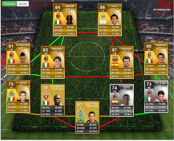 CALCIOMERCATO MILAN KHALIL – E’ un Milan davvero offensivo quello disegnato dall’amico e tifoso rossonero, Khalil. Il fan del Diavolo ha scelto un 4-4-2 (che sembra più un 4-2-4), con la coppia d’attacco formato da Balotelli e Tevez. A centrocampo, il sogno Fabregas al fianco di Montolivo, con gli esterni occupati da El Shaarawy e Diamanti. Infine la difesa con Ogbonna e Zapata in mezzo, spalleggiati da De Sciglio e Santon sulle corsie e Julio Cesar in porta. Come vi sembra questo 11 decisamente offensivo? Se anche tu hai un Milan da proporci mandacelo nell’apposito spazio commenti di Facebook.
