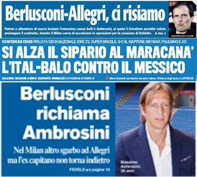 I titoli Gazzetta, CorSport e Tuttosport: Berlusconi richiama Ambro, si alza il sipario sull’Ital-Balo – Foto 16/06/2013 - 07:36 di Redazione2 RASSEGNA STAMPA MILAN FOTO – Di seguito potete trovare i principali titoli dei tre quotidiani sportivi, La Gazzetta dello Sport, Corriere dello Sport e Tuttosport, riguardanti naturalmente il nostro Milan. La redazione di Milanlive.it