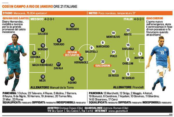 MESSICO ITALIA PROBABILI FORMAZIONI – Esordio della Nazionale nella Confederations Cup. Questa sera alle ore 21.00, allo stadio Maracanà di Rio de Janeiro, gli azzurri di Cesare Prandelli sfideranno il Messico. Un’Italia un po’ diversa rispetto al solito quella che scenderà in campo questa sera. Viste anche le ultime difficoltà e qualche acciacco di troppo, il ct opta per un 4-3-2-1 con Balotelli prima punta e la novità Giaccherini sulla trequarti al fianco di Marchisio. In difesa i due terzini saranno Abate e De Sciglio mentre Montolivo andrà ad occupare l’interno di destra al fianco di Pirlo e De Rossi, quest’ultimo, unico giocatore non facente parte del blocco Juve/Milan.