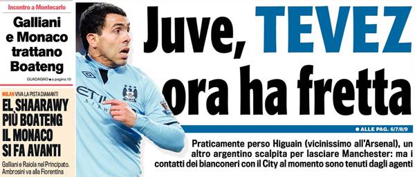 I titoli Gazzetta, CorSport e Tuttosport: il Monaco vuole El Sha + il Boa, Tevez ha fretta – Foto 19/06/2013 - 07:31 di Redazione2 RASSEGNA STAMPA MILAN FOTO – Di seguito potete trovare i principali titoli dei tre quotidiani sportivi, La Gazzetta dello Sport, Corriere dello Sport e Tuttosport, riguardanti naturalmente il nostro Milan. La redazione di Milanlive.it
