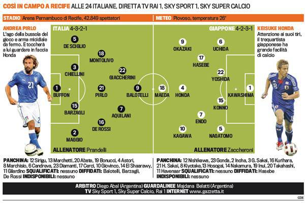 ITALIA GIAPPONE PROBABILI FORMAZIONI – Poco più in basso troverete le probabili formazioni di Italia-Giappone, gara che si giocherà questa sera alle ore 00.00 valevole per il secondo turno della Confederations Cup. Il commissario tecnico Cesare Prandelli conferma il 4-3-2-1 con Balotelli prima punta. Ancora panchina per El Shaarawy mentre sulla trequarti, al fianco di Giaccherini, troviamo la novità Aquilani al posto di Marchisio. Rispetto alla gara col Messico cambio anche sulla corsia destra con Abate in panchina e al suo posto il difensore del Napoli, Christian Maggio.